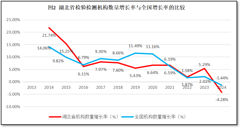 湖北省检验检测机构数量增长率与全国检验检测机构数量的增长率进行比较,如图2所示。