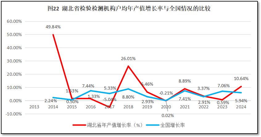 再来看湖北省检验检测机构人均年产值增长率与全国人均年产值增长率的比较,如图19所示。