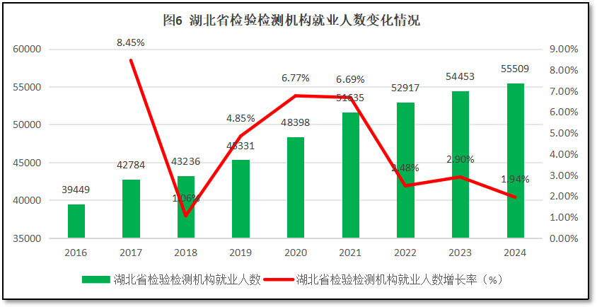 由图6可见,从2016年到2024年,湖北省检验检测机构就业人口数量总体保持增长,从2016年的3.9万人增长到2024年的5.55万人,年均增速4.39%。从增长率曲线看,湖北省检验检测机构就业人数增长率在2020-2021年出现一个比较高的增长峰值,此后逐年下降。2022年以来的年增长率均为3%以下。